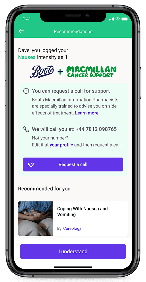 Boots Macmillan Information Pharmacists, working directly with the Guy’s Cancer team, are now able to provide fast, expert support when you log mild symptoms such as nausea or fatigue into your Careology app